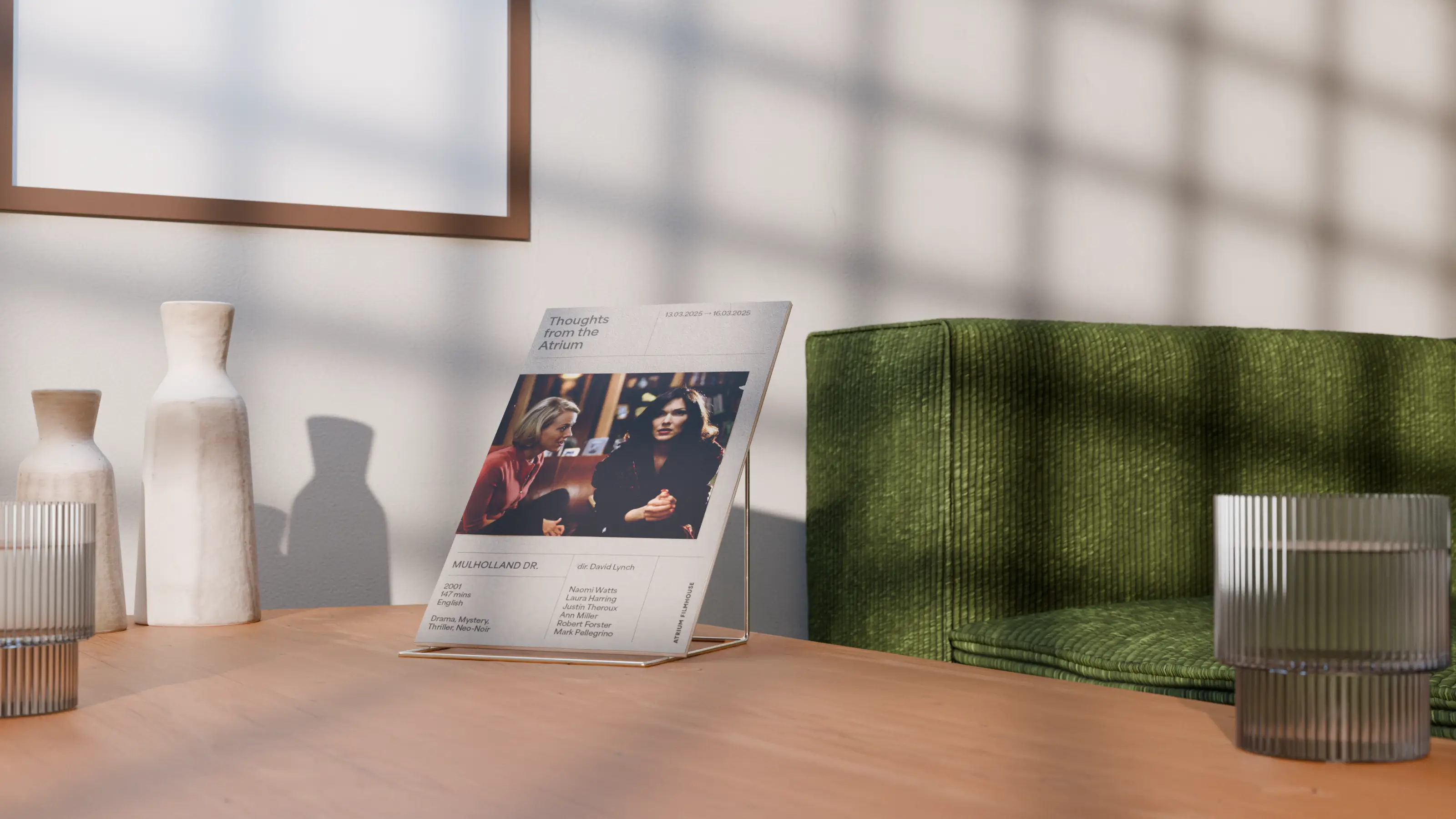 some of the motifs I found inspiration in were modernist architecture, rich autumnal colours, authentic materials like teak wood, porcelain, glass block, and jute fabric, film grain and motion blur, and the functional design of items like paper film tickets